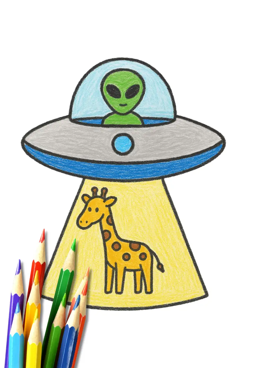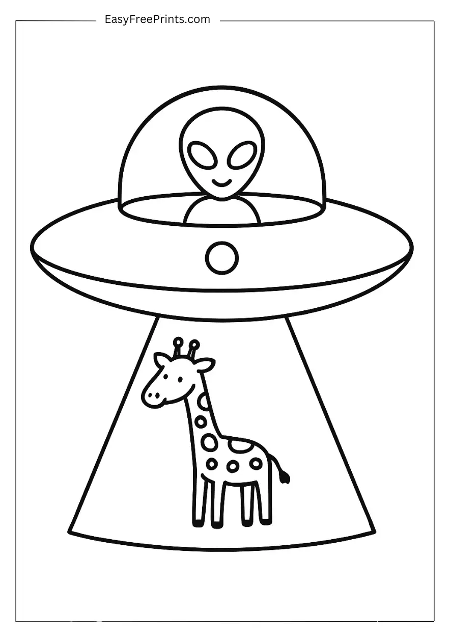A playful giraffe is being lifted into a flying saucer by a cheerful alien. The giraffe’s big spots and long neck make it extra fun to color. This simple alien coloring page is perfect for animal lovers who want something quick and creative.