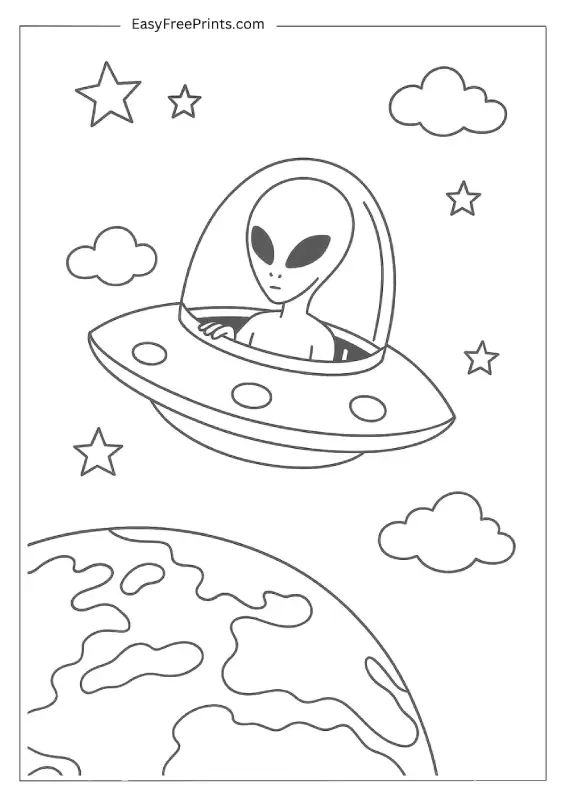 A single alien pilots a small spaceship, floating above the Earth with stars and clouds all around. It’s a simple design that’s perfect for younger kids who like space scenes. The open background makes it easy to color, and the Earth detail adds a nice touch.