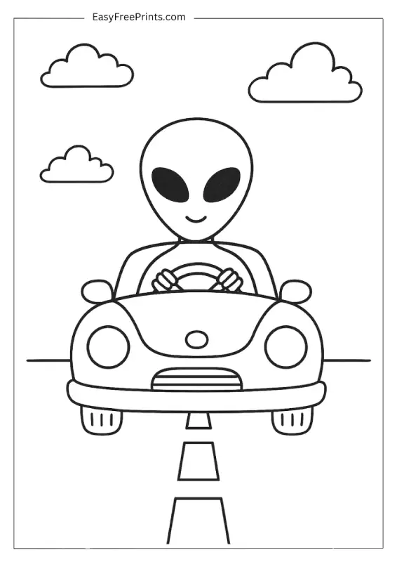 This one’s just a vibe. An alien sitting behind the wheel of a spaceship like it’s no big deal, hands on the controls and cruising through space. The lines are super clean and there’s not much going on around it, which makes it easy to color but still fun to look at. It’s got that “everyday alien stuff” energy.