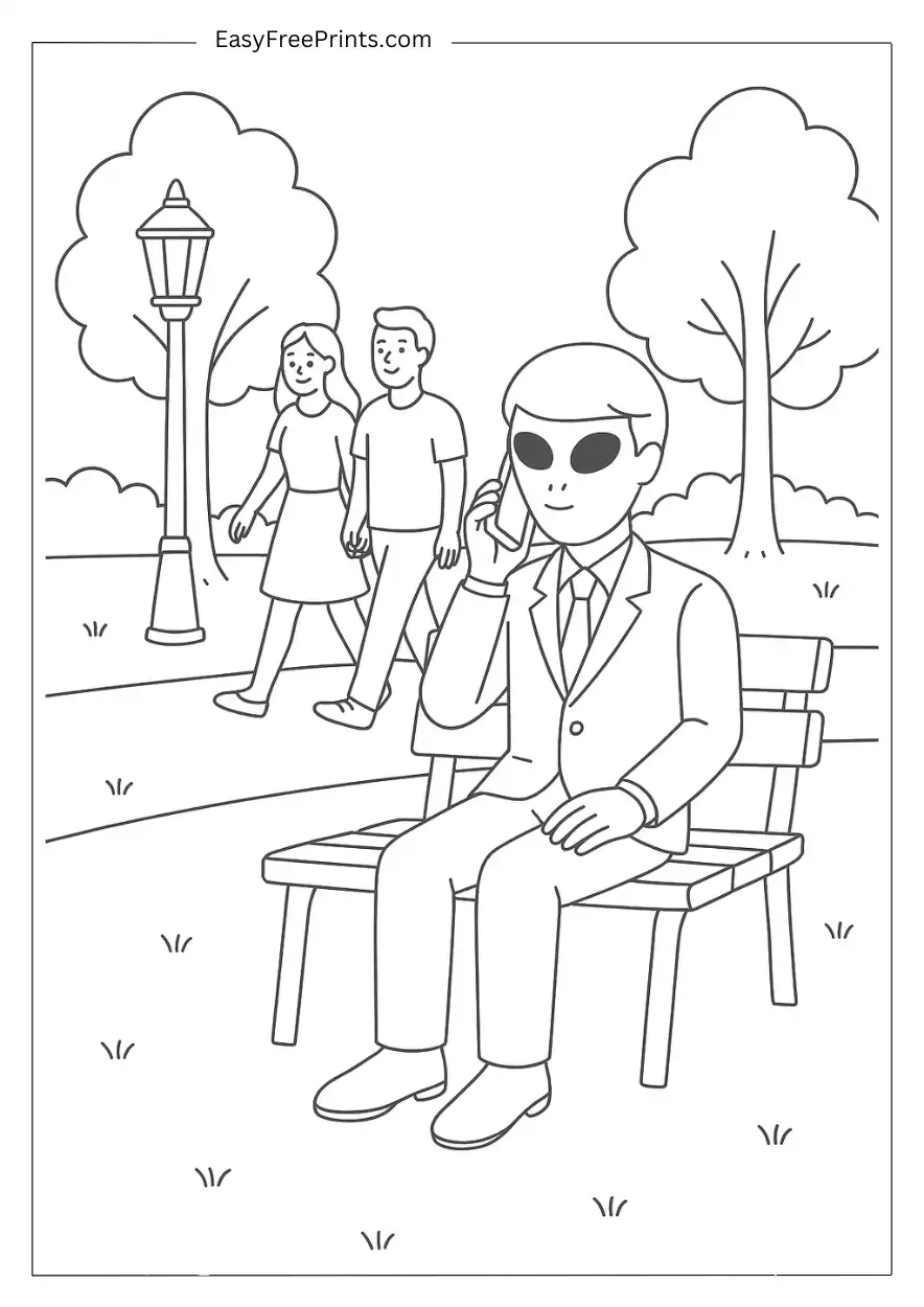 This one’s lowkey. An alien dressed like a human is sitting on a bench talking on the phone, and a couple walks by not noticing anything weird. If you want a calm scene that’s also kinda hilarious once you get the joke, pick this one.