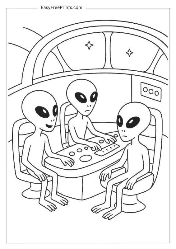 A cool little peek into the control room, with three aliens sitting around and messing with buttons. I like how it shows what’s going on inside the UFO, not just outside. Great for kids who love futuristic scenes and techy stuff.