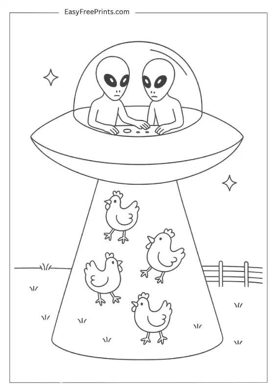 A classic alien moment. A cow is being pulled up into a saucer with a beam of light, and it looks completely shocked. This one’s easy to color and has a bit of humor to it too.