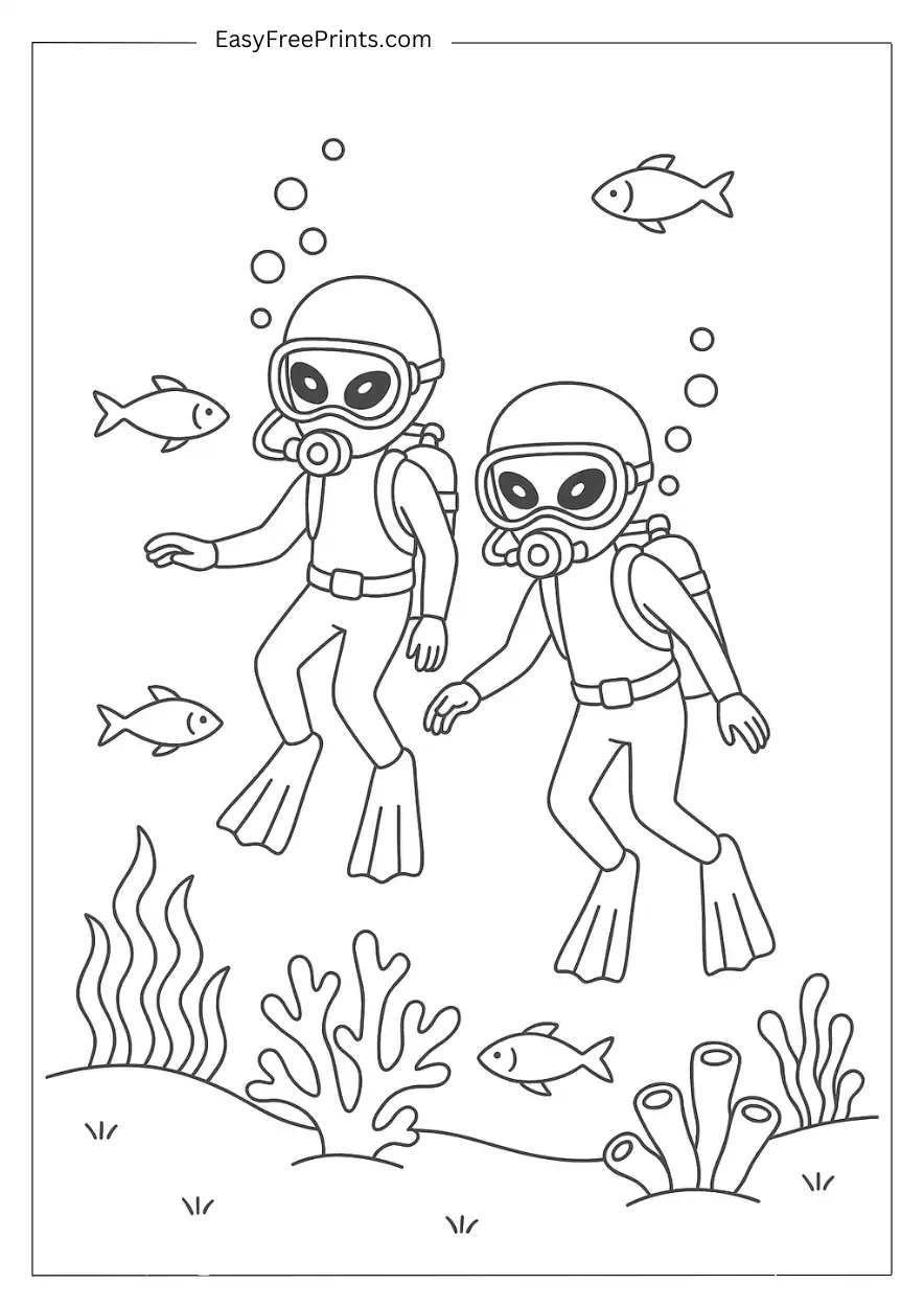 Full-on scuba gear underwater aliens surrounded by fish and coral. A mix of ocean and outer space. If you want something different that still makes sense in a weird way, this one’s fun to color.