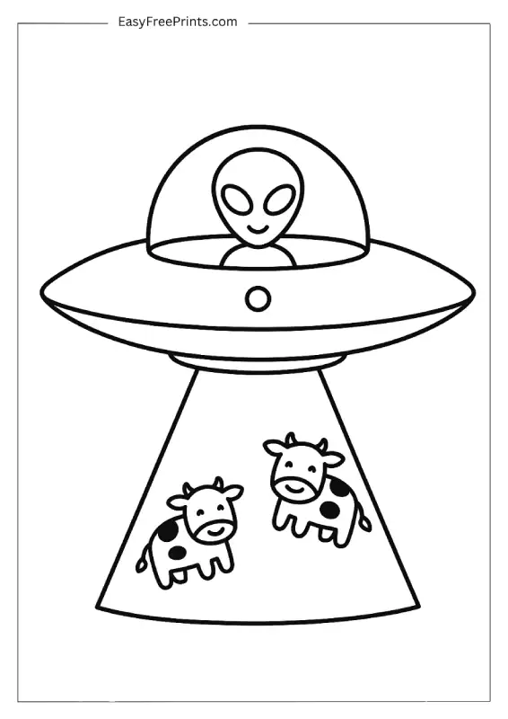 TThis printable coloring page shows a happy alien using a beam of light to lift up two cute cows. Everything’s drawn with a clean, bold style that’s easy to fill in. Great for toddlers or preschoolers who love animals and silly space scenes.