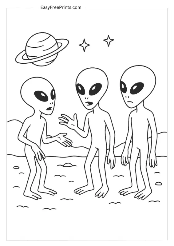 Three quirky aliens are standing around chatting under a star-filled sky with Saturn in the background. The way they’re posed makes it look like some serious alien gossip. This alien coloring page is simple but full of character.