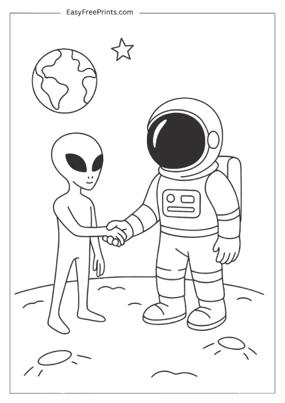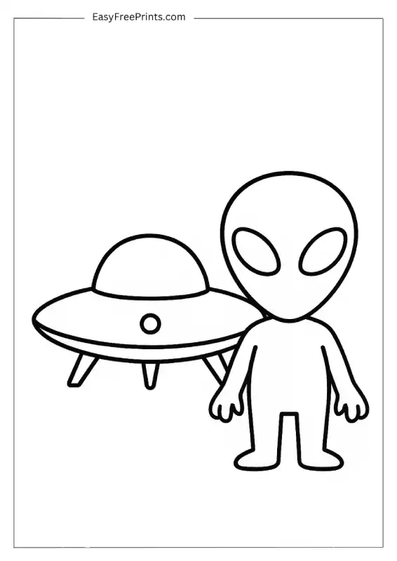 A basic alien standing next to a small ship, with soft lines and open space. If you’re looking for a quick printable that’s easy for little hands to color, this one checks all the boxes.