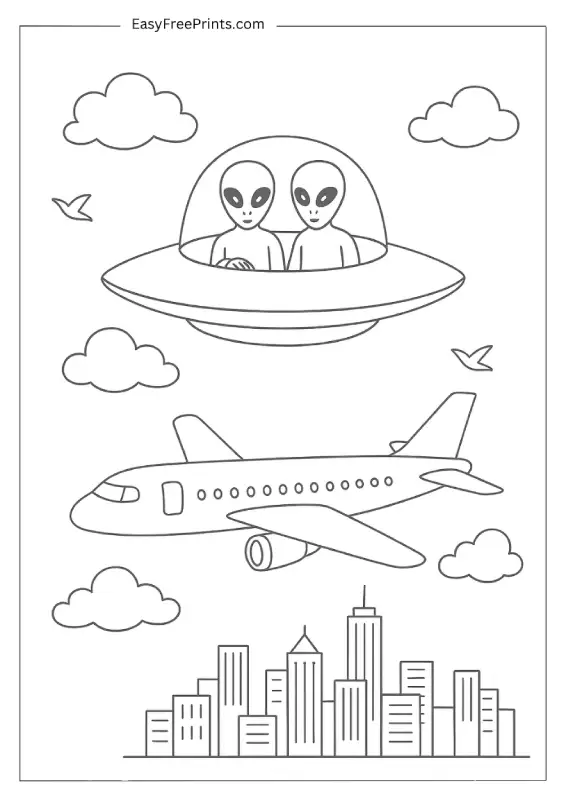 Two aliens are flying their saucer high above a city while a regular airplane passes by. It’s a fun little moment where sci-fi meets everyday life. The mix of clouds, birds, and buildings gives kids plenty to color without being too complex.