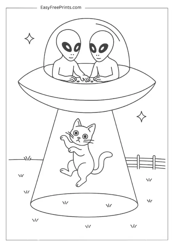 This scene is more relaxed. A small cat is being lifted into the ship in a soft beam, and everything feels calm. It’s simple and sweet, which makes it a nice coloring page for younger kids.