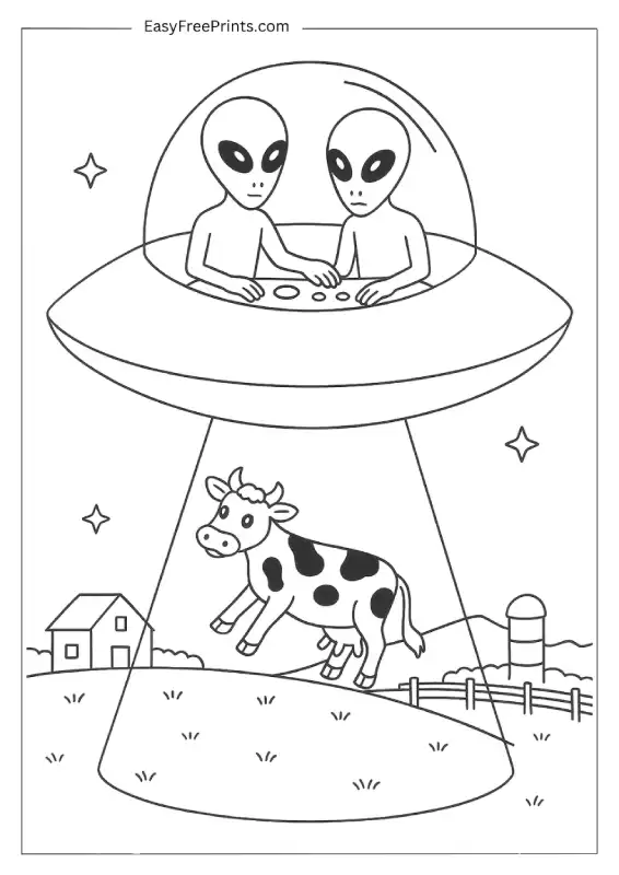 A classic alien moment. A cow is being pulled up into a saucer with a beam of light, and it looks completely shocked. This one’s easy to color and has a bit of humor to it too.