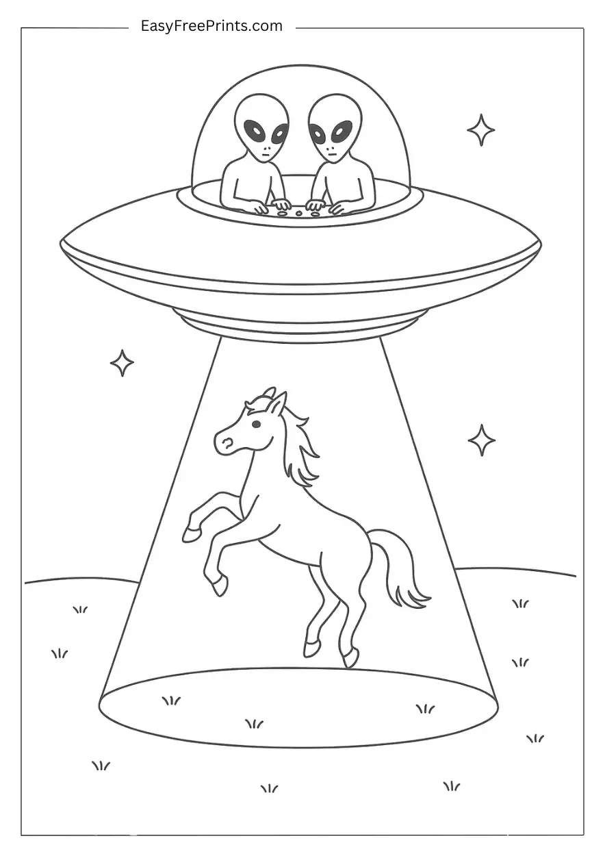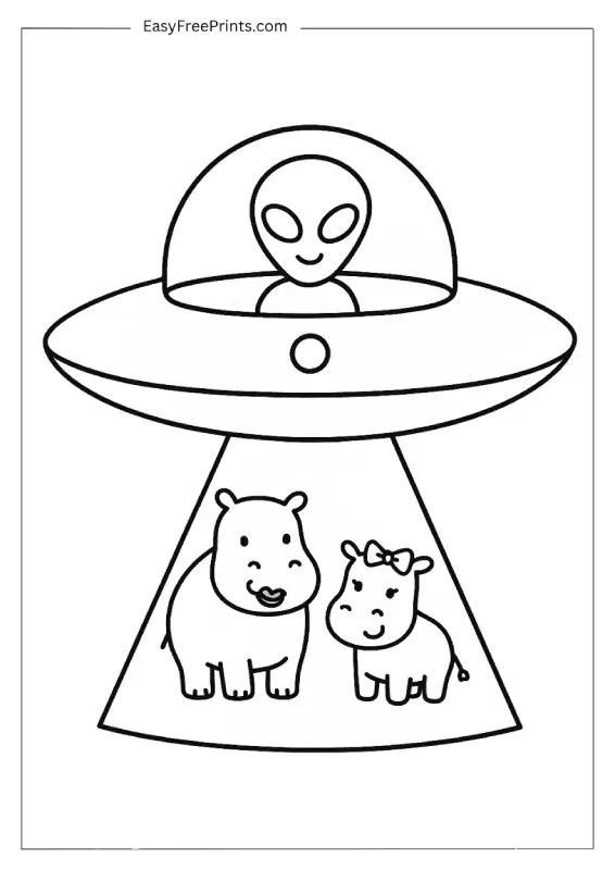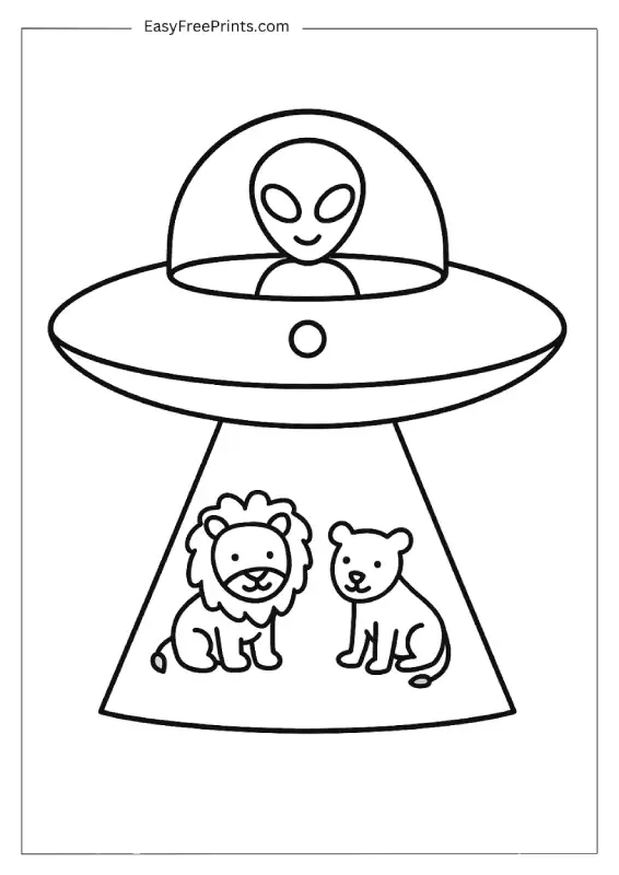 A playful giraffe is being lifted into a flying saucer by a cheerful alien. The giraffe’s big spots and long neck make it extra fun to color. This simple alien coloring page is perfect for animal lovers who want something quick and creative.