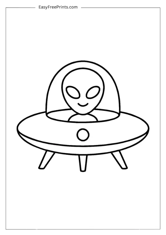 A classic alien with a calm expression sits inside a dome-shaped ship. There’s nothing extra on the page, just a clean focus on the character. This one is great for younger kids or anyone who enjoys a focused, no-clutter page.