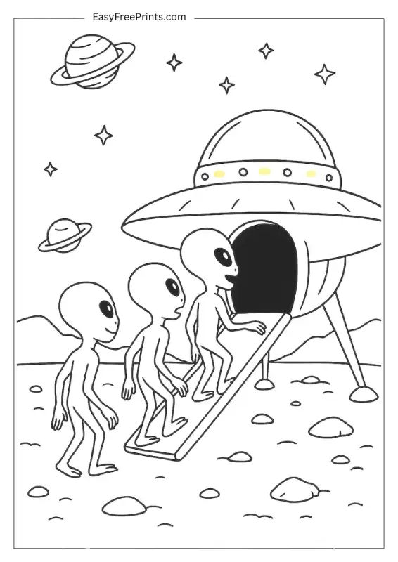 These three aliens are heading up the ramp into their spaceship, ready for takeoff. The ship is huge, floating above a rocky planet, and there’s a nice balance of open space and detail. A great alien printable to spark some imagination.