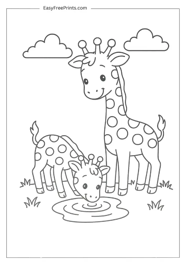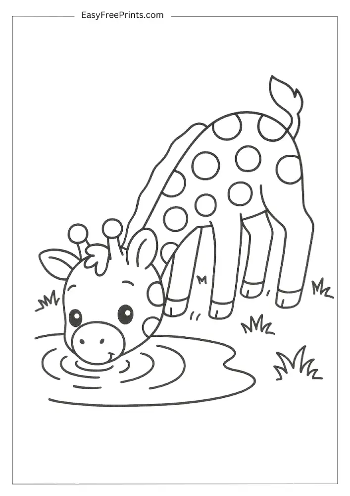 This cute giraffe is bending down to drink from a little pond, with big curious eyes and a playful vibe. A great pick for younger kids who love animals and want a fun, easy page to color.