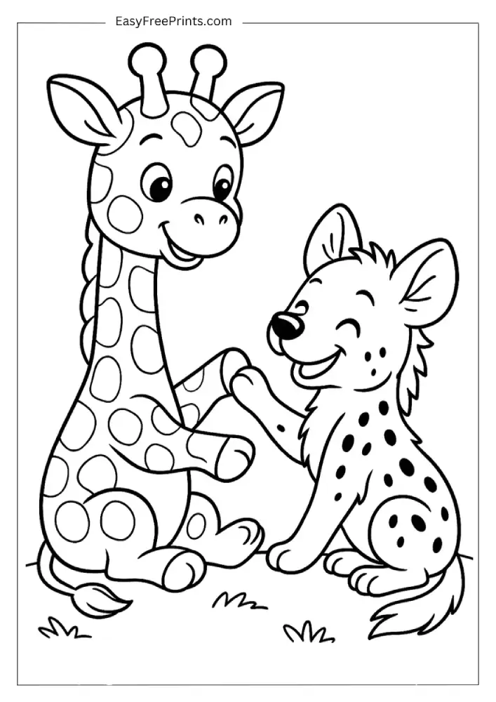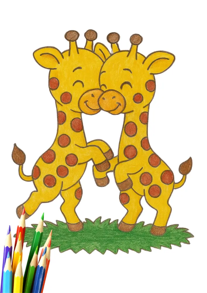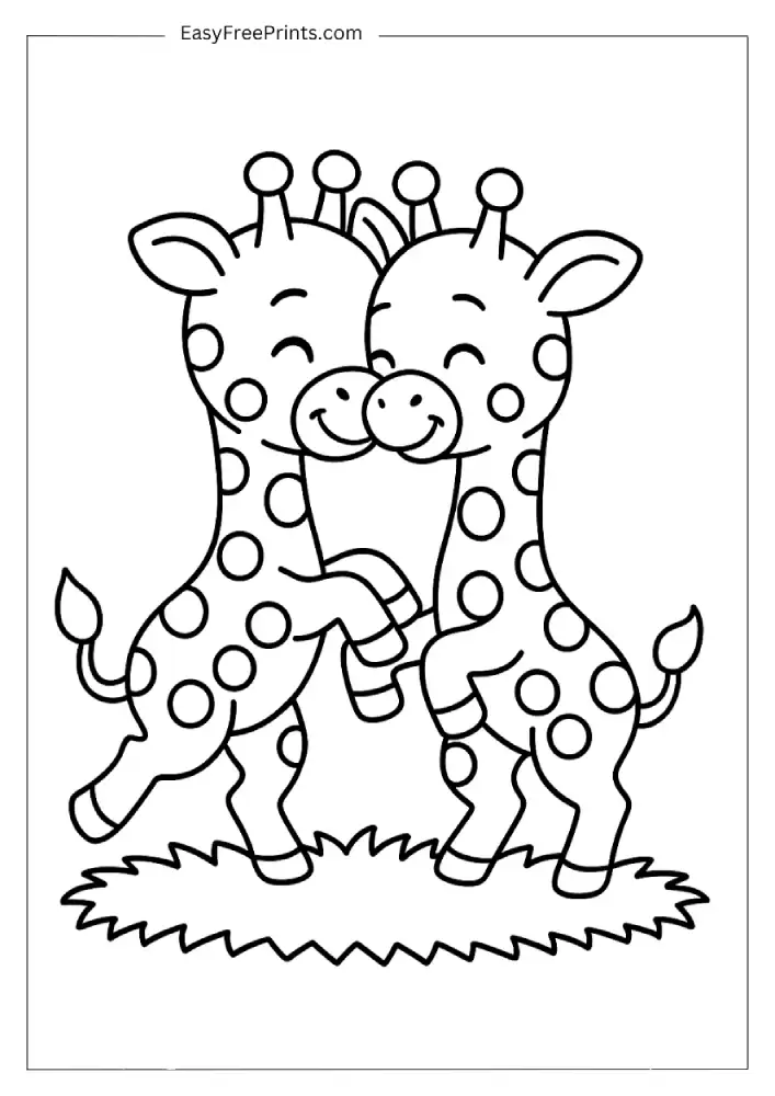 These two cheerful giraffes are holding hooves and sharing a joyful moment. Their matching smiles and playful pose make this page feel full of love and fun. A super cute option for kids who enjoy coloring animal buddies.
