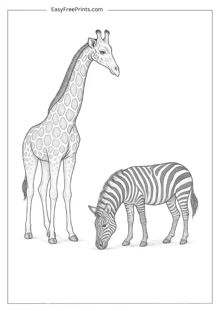 A calm scene with a giraffe standing tall and a zebra grazing peacefully beside it. This one has a more realistic style, perfect for kids who want to try shading and more detailed coloring.