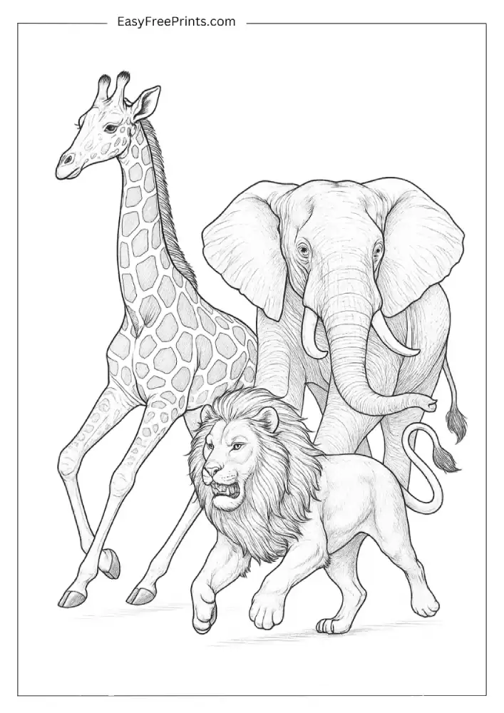A powerful group of safari legends walking together. This page is full of movement and bold lines, giving kids a chance to bring some of Africa’s most iconic animals to life.
