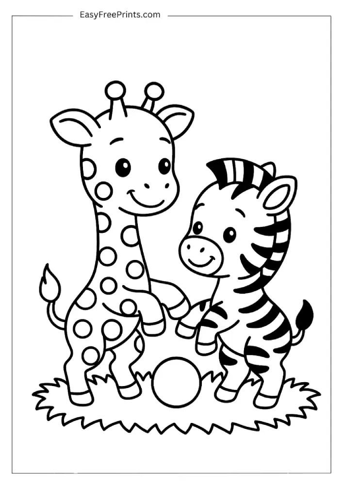 A sweet little giraffe and its zebra friend are ready for playtime! With a ball between them and big happy faces, this page is perfect for any child who loves coloring animals and friendship scenes.