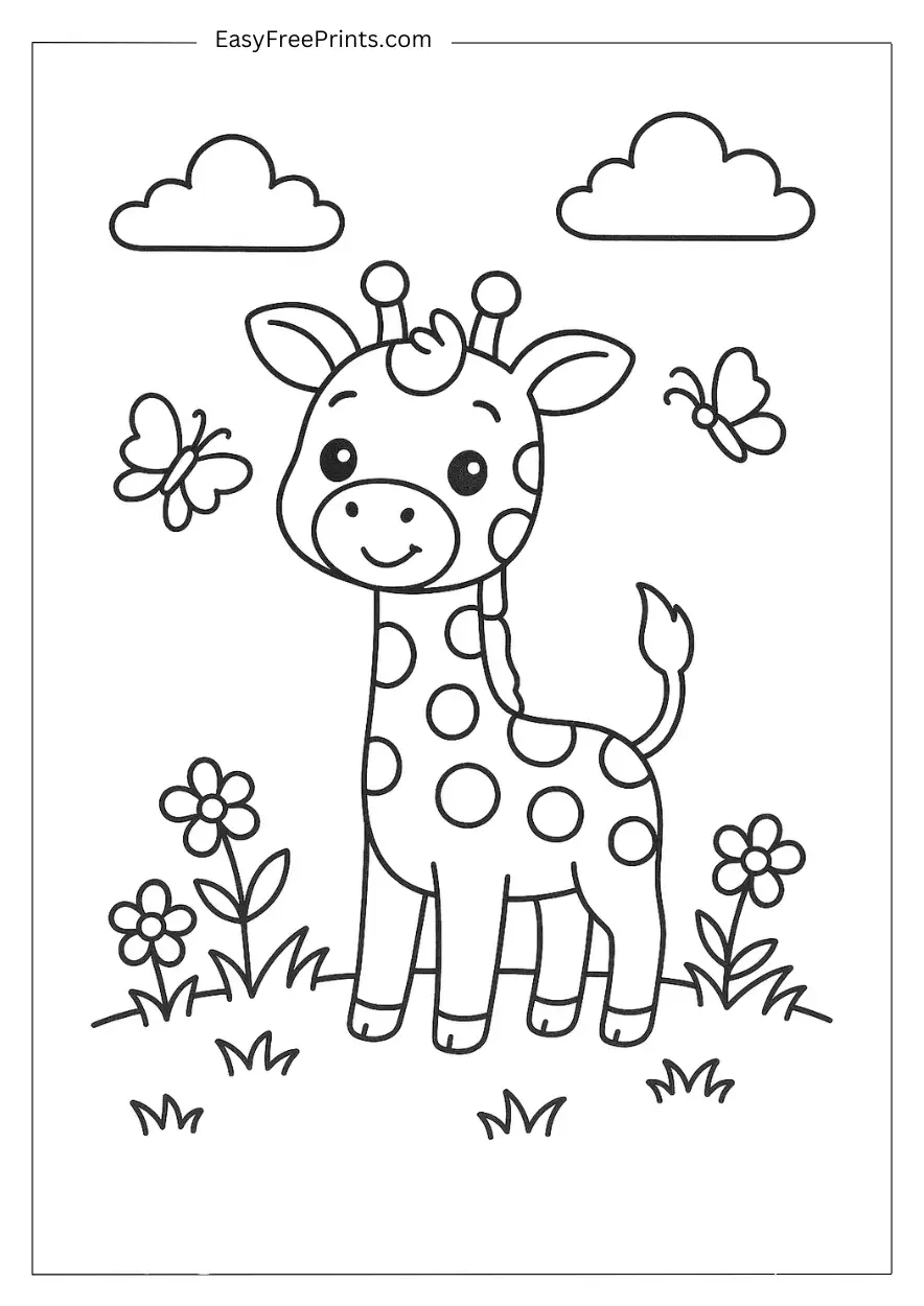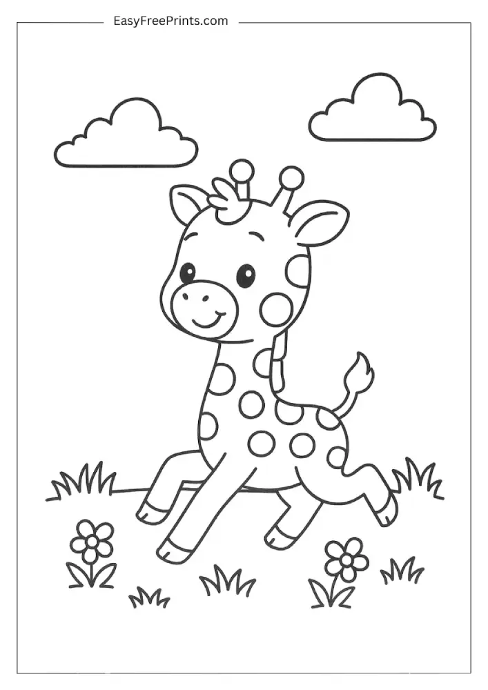 This cheerful little giraffe is full of energy, running through a field of flowers with a big smile on its face. A super fun and easy coloring page that’s perfect for younger kids who love cute animals!