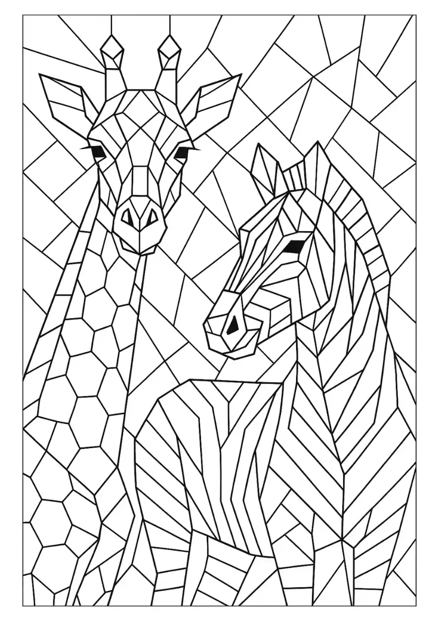 A bold and stylish design featuring a giraffe and a zebra drawn in sharp, angular shapes. This one is great for older kids and adults who enjoy more modern, abstract coloring.