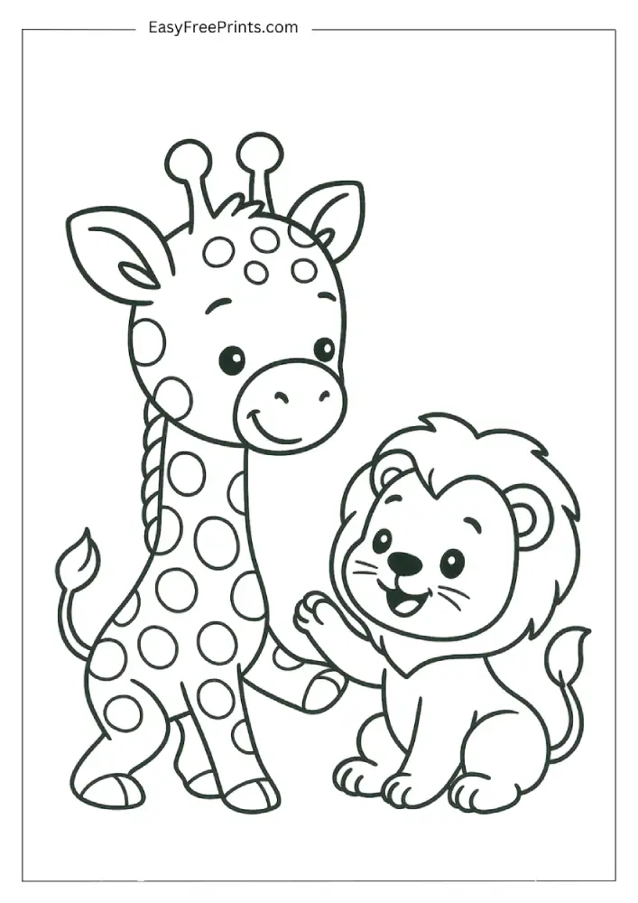 These two young animals look like best pals! With the giraffe standing tall and the lion cub reaching up, it’s a charming page full of playful energy and big smiles.