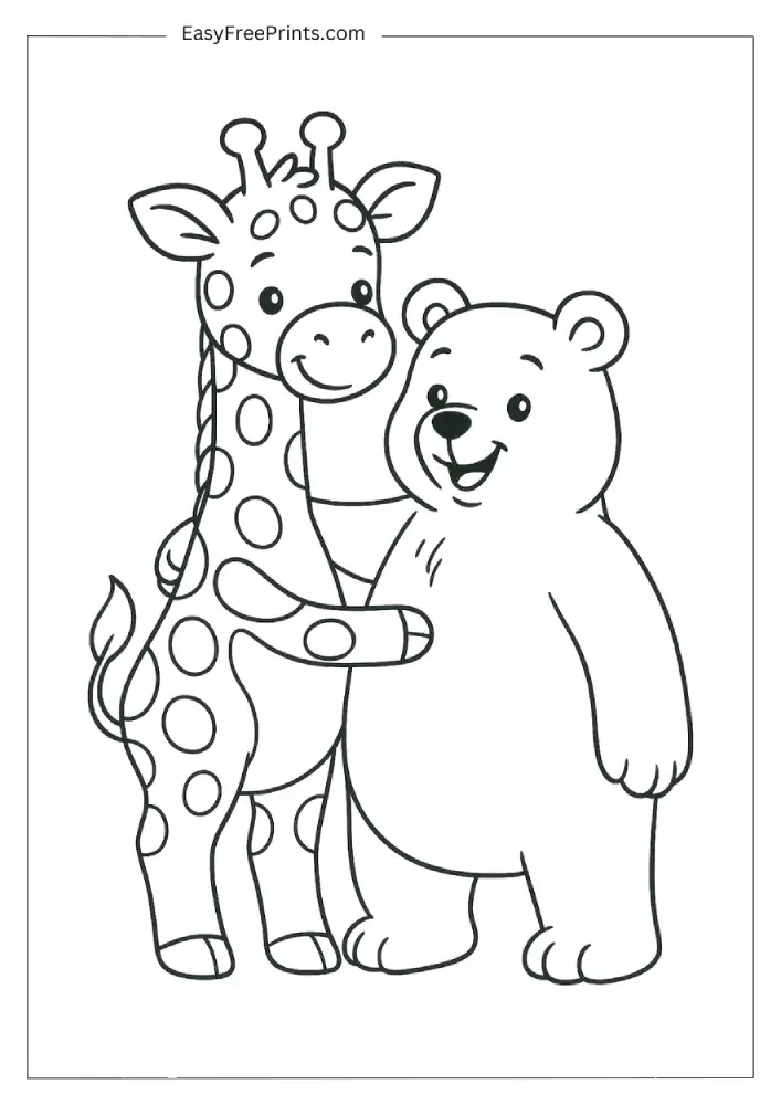 A warm and cozy hug between a giraffe and a smiling bear. This adorable duo is all about spreading kindness and is super fun for kids to color in.