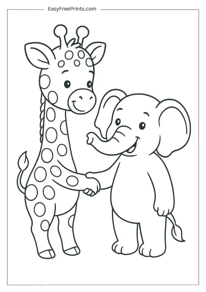 Two jungle buddies meet with a friendly handshake. This page shows a sweet moment between a giraffe and an elephant, perfect for little ones who enjoy animal friendships.