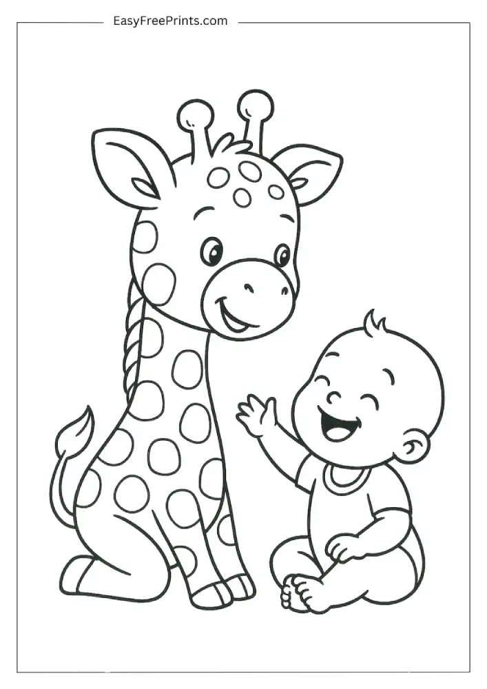 A baby and a giraffe bonding in the cutest way possible. Their happy expressions make this page extra heartwarming and fun for both kids and parents to color.