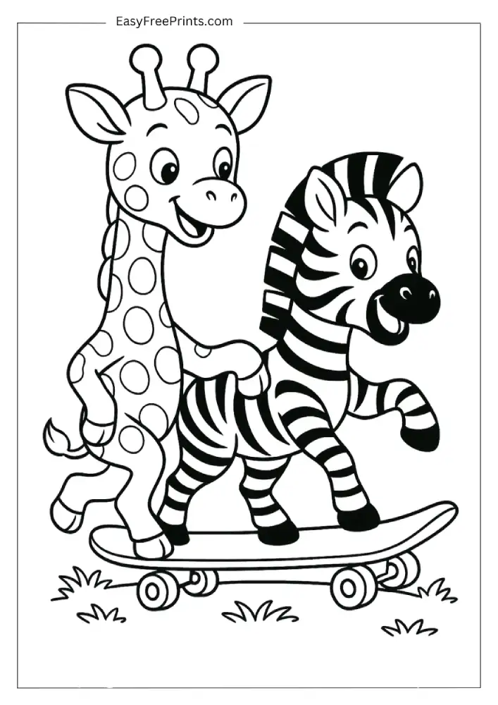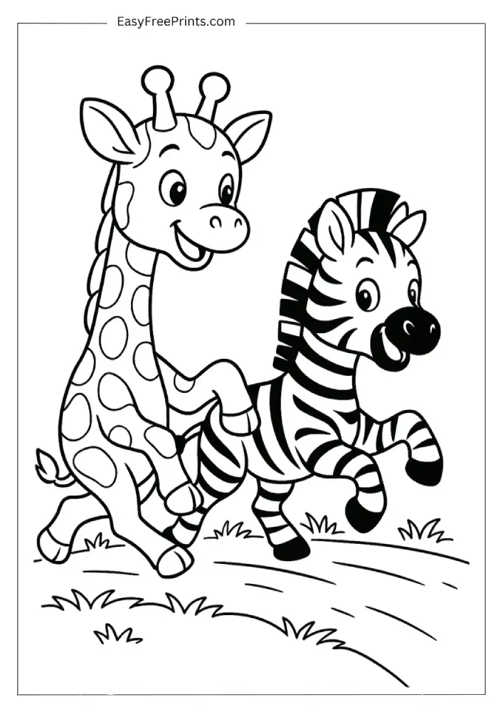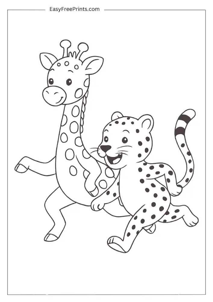 This one’s all about speed and smiles. The giraffe and the cheetah are racing side by side, both having the time of their lives. A great pick for kids who love action-packed coloring pages.