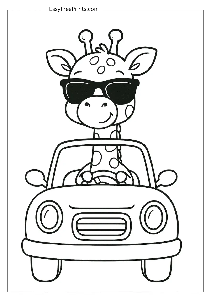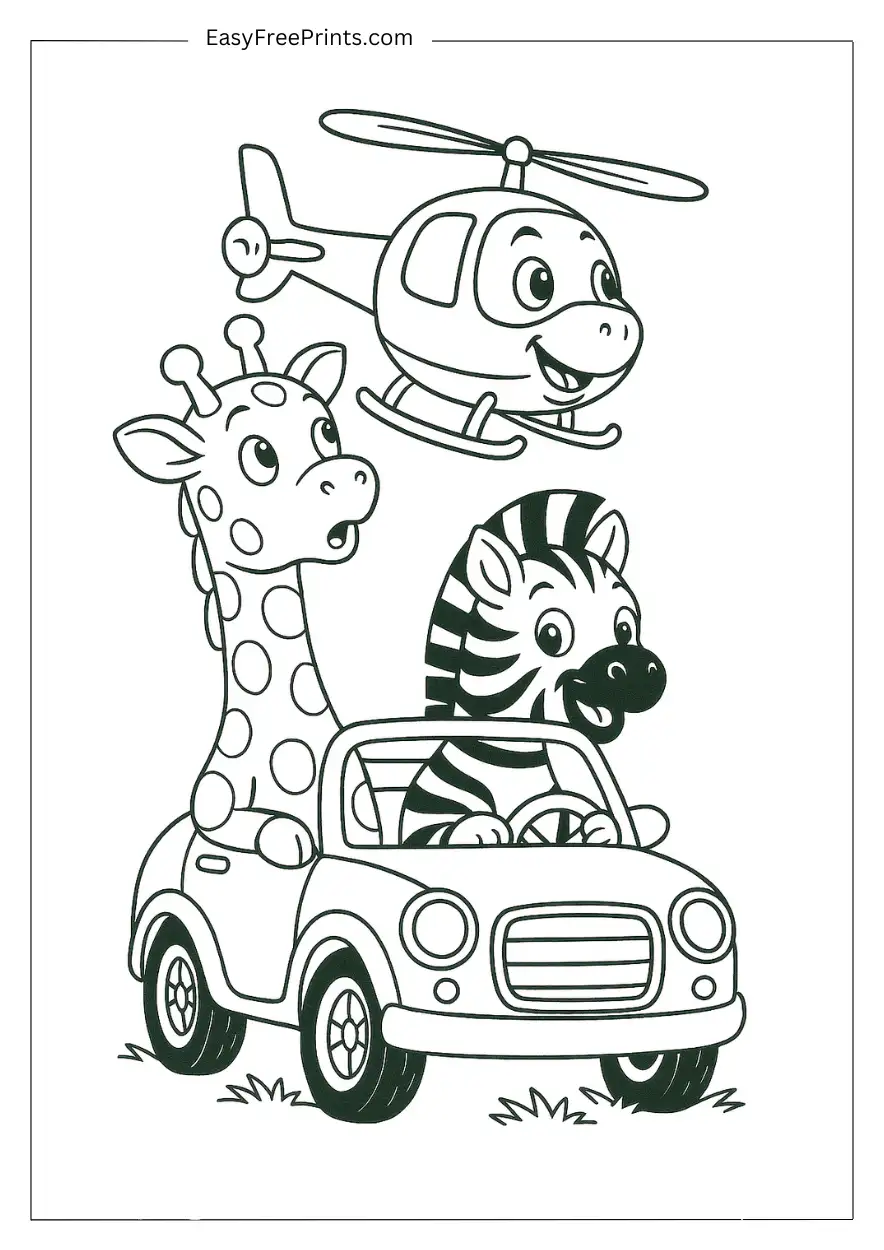 A cheerful zebra is driving the car while the giraffe enjoys the ride, and a smiling helicopter flies by. It’s a playful mix of animals and vehicles that kids will love bringing to life with color.