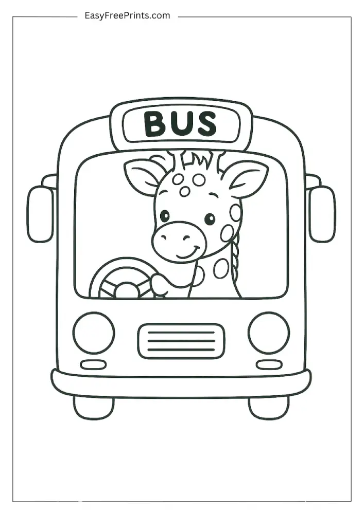 All aboard! This cute giraffe is behind the wheel of a big bus, ready to take everyone on a fun ride. A silly and cheerful coloring page that kids will love adding color to.