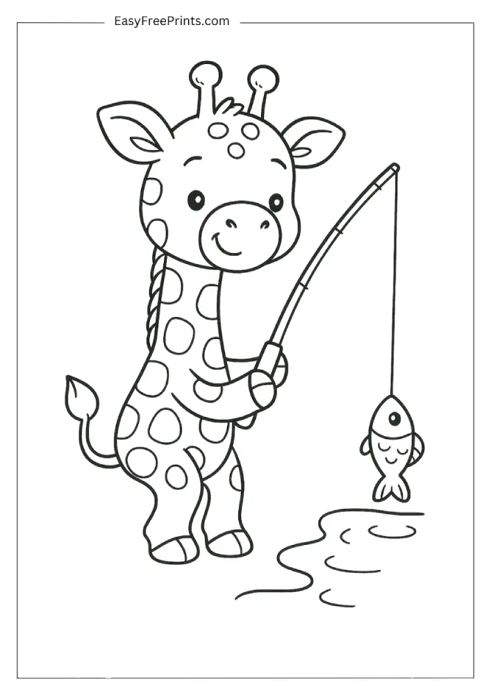 Look who caught a fish! This giraffe is holding a fishing rod by the water with a little fish on the hook. A peaceful and quirky outdoor scene to bring to life with color.