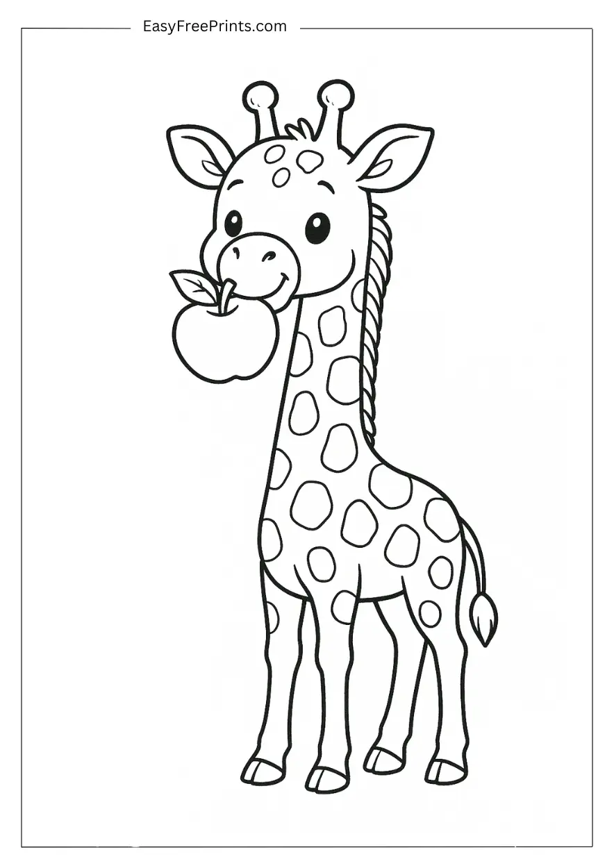This happy giraffe just found a tasty snack! Holding a big juicy apple in its mouth, it’s a simple and sweet page to color, especially for kids who love nature and animals.