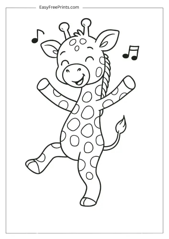 This giraffe is clearly having a good time, dancing to the beat with music notes floating around. A joyful page full of movement, perfect for kids who love to dance and color!