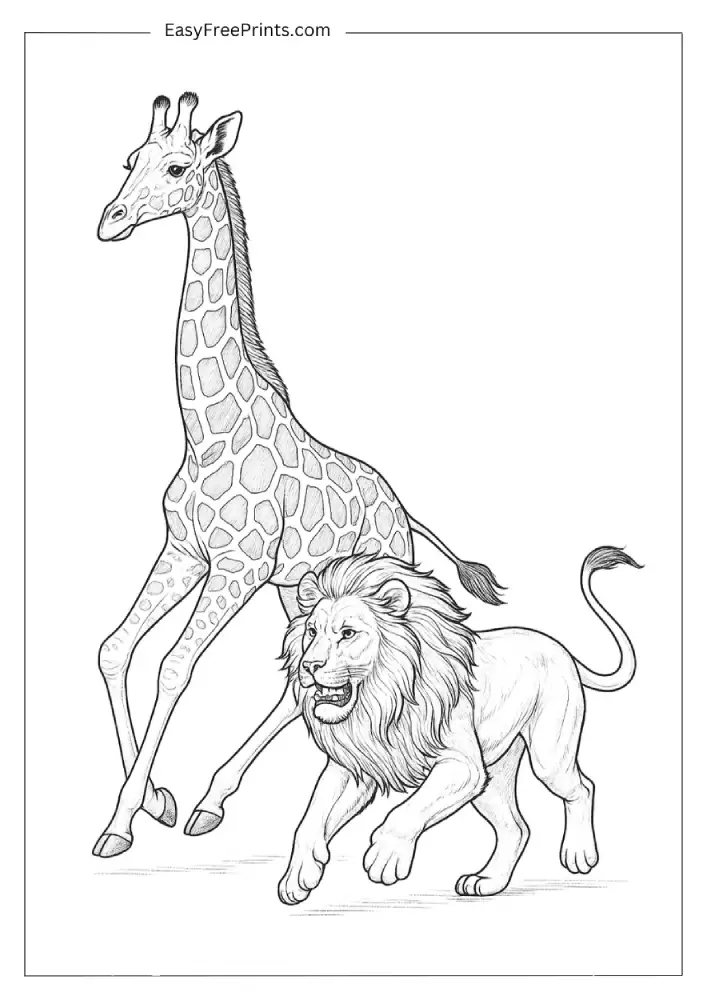 This powerful duo is captured mid-stride, both moving with strength and grace. It’s a detailed scene that feels alive, perfect for older kids or anyone who enjoys realistic wildlife coloring.