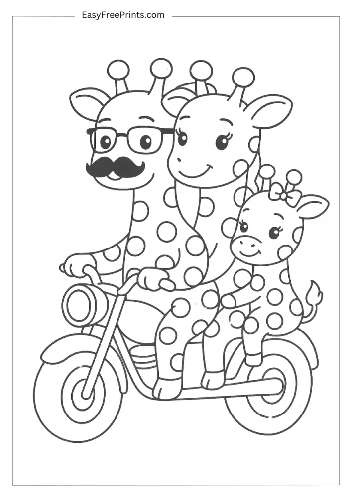A fun-loving giraffe family is out for a joyride! Dad’s rocking glasses and a mustache, Mom’s got her glam look, and their baby is holding on tight. This playful page is great for kids who love animals and vehicles all in one!