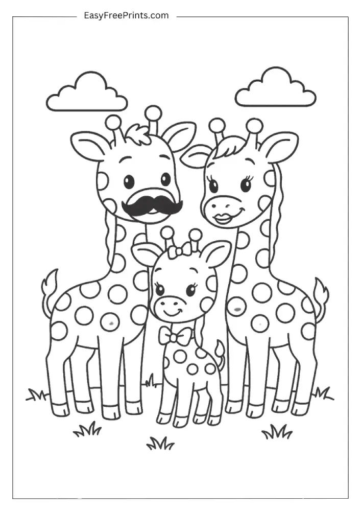 Meet this adorable giraffe family! Dad has his signature mustache, Mom’s got her lipstick on, and their little one looks dapper with a cute bowtie. A heartwarming family scene that’s perfect for coloring together.